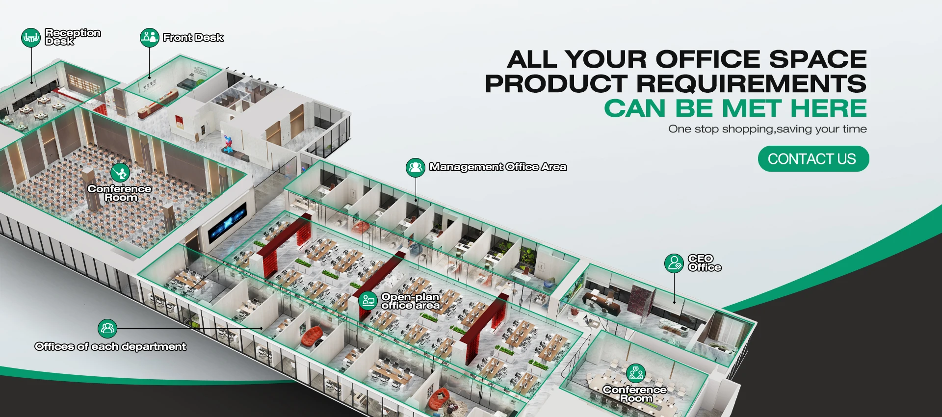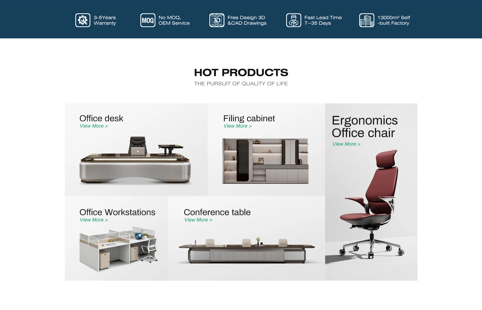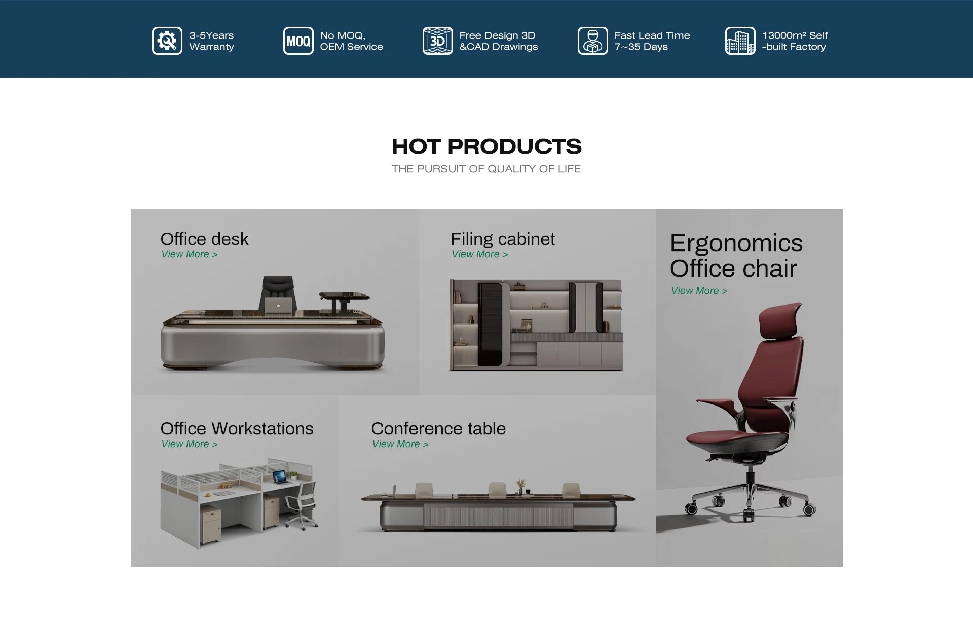Belangrijkste producten:Directiebureau, archiefkast, vergadertafel, kantoorbank, werkstation